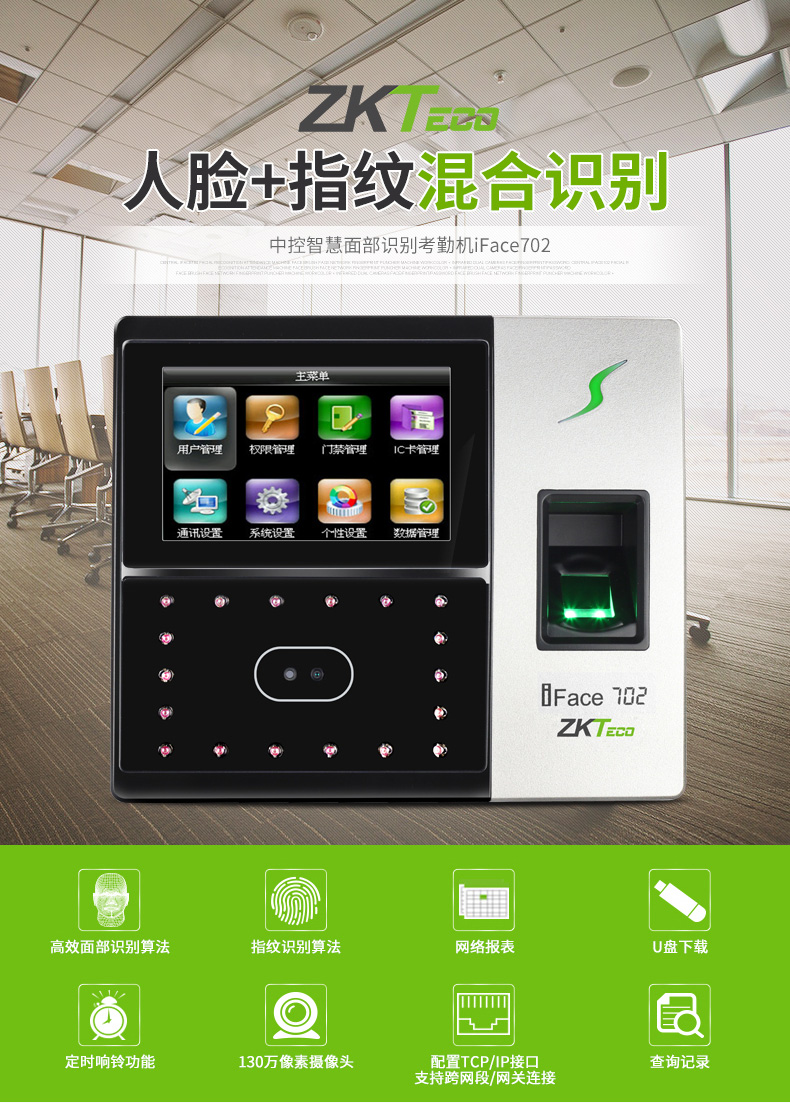 iFace 702人脸指纹考勤机 iFace102人脸+指纹识别 考勤 中控Plus 3969人脸指纹考勤 IFACE 3指纹人脸考勤机 U160 / U160-ID专业型指纹考勤 iClock360彩屏网络指纹机 TX628指纹考勤机 U260指纹考勤机 iClock300 TFT屏专业型指纹考 iClock660多媒体指纹考勤机